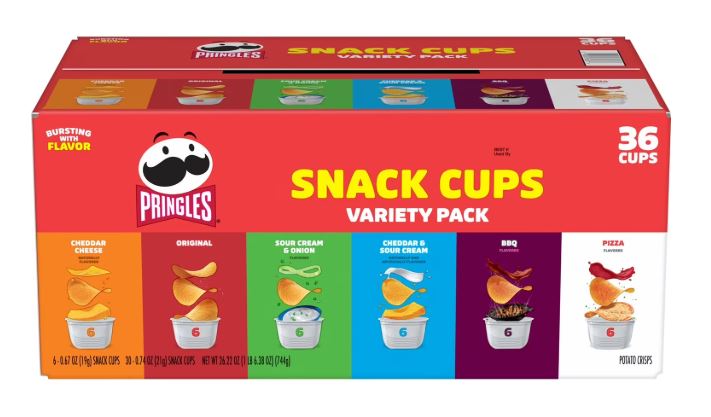 Includes 6 cups each of Sour Cream and Onion, Original, Cheddar Cheese, BBQ, Cheddar and Sour Cream, and Pizza Pringles.